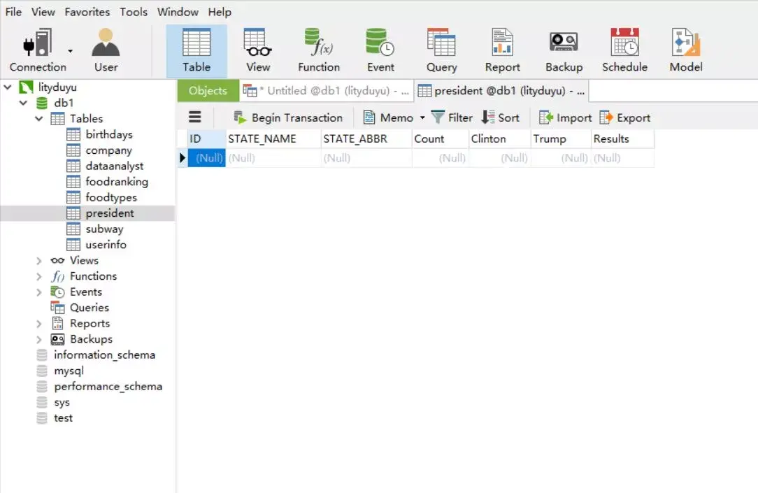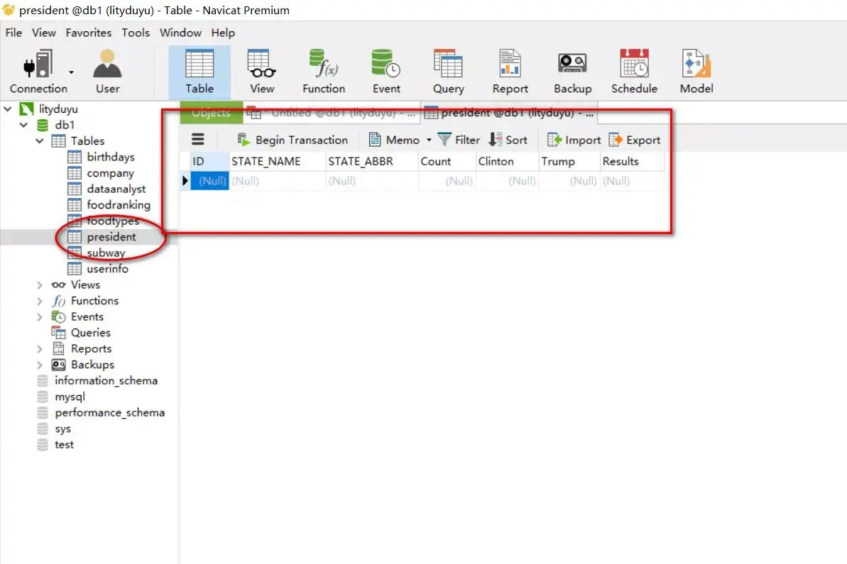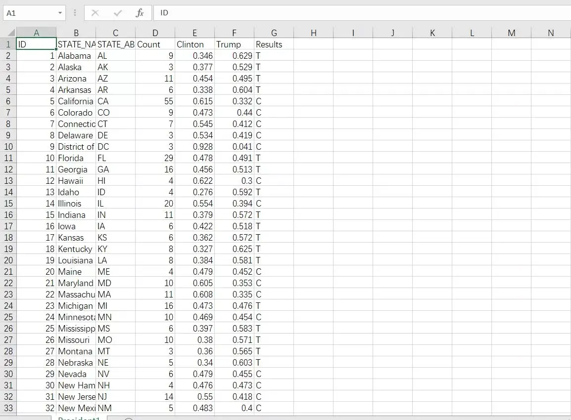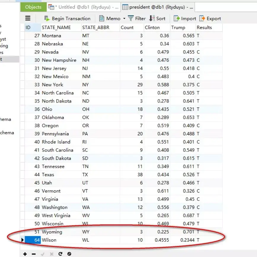 select "ID","STATE_NAME","STATE_ABBR","Count","Clinton","Trump","Results" -- 为要导出的字典命名union select * from db1.president -- 指定要从目标表中导出的字段(与第一句指定的字段严格对应)into outfile 'D:/President1.csv' -- 导出目录及文件名character set gbk -- 设置输出编码FIELDS TERMINATED BY ',' -- 字段分隔符OPTIONALLY ENCLOSED BY '"' -- 文本包括符号(可选,这里注释掉了)escaped by '"' -- 冲突转义符(可选,这里注释掉了)LINES TERMINATED BY '\r\n'; -- 换行符