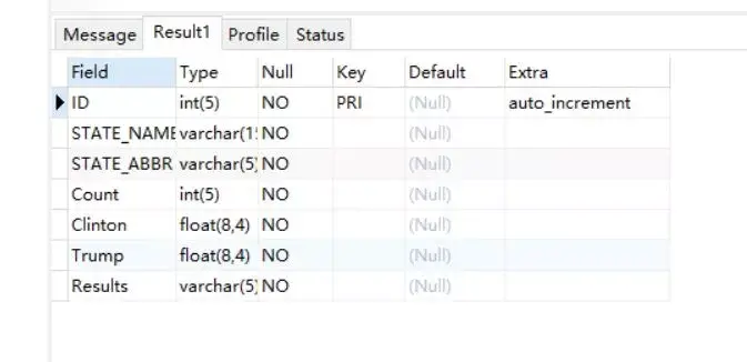 CREATE TABLE President ( ID INTEGER(5) NOT NULL AUTO_INCREMENT, -- ID是主键,格式为整数,非空值、自增列 STATE_NAME VARCHAR(15) NOT NULL, -- 字符型(15位) STATE_ABBR VARCHAR(5) NOT NULL, -- 浮点 Count INTEGER(5) NOT NULL, -- 整数型(5位) Clinton FLOAT(8,4) NOT NULL, -- 浮点型(8位,保留四位小数) Trump FLOAT(8,4) NOT NULL, Results VARCHAR(5) NOT NULL, PRIMARY KEY (ID) );