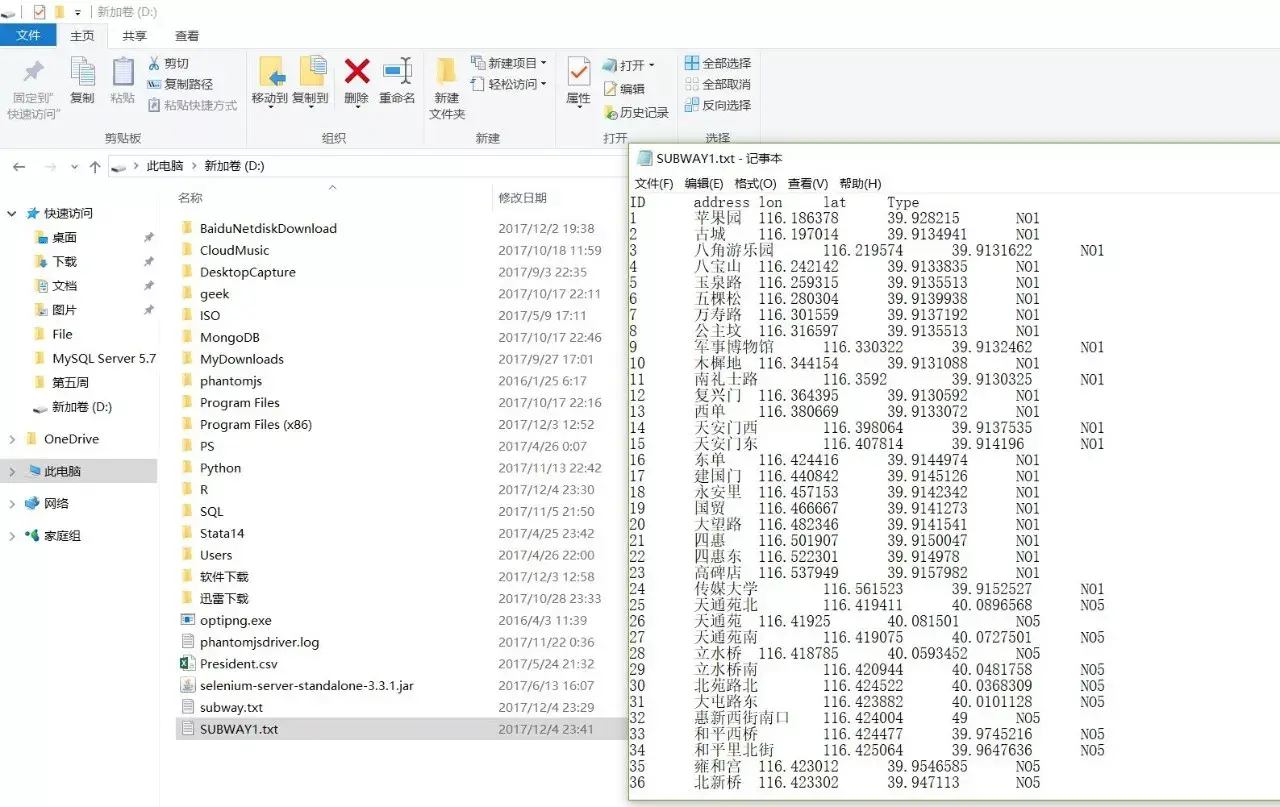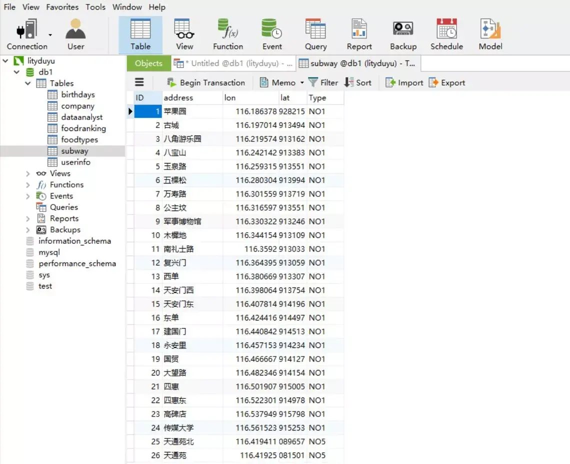 load data local infile 'D:/subway.txt' into table db1.subway -- 导入本地文件语句character set gbk -- 设置导入文件编码 fields terminated by '\t' -- 指定txt文件内的字段分隔符optionally enclosed by '"' -- 指定字符闭合符(可选参数,有些格式txt会设置字符使用双引号/单引号包括等格式)escaped by '"' -- 指定转义符(字符内含符号与闭合符冲突,使用何种符号进行包括并转义,使其保留原意)lines terminated by '\r\n' -- 指定换行符ignore 1 lines -- 指定从文件第几行开始导入(如果本地文件有行名,需要略过一行)(address,lon,lat,Type); -- 最后一行指定要导入的列名(次内列名需与之前新建的空表列名严格匹配)主键可以设定为导入列中的某一列(保证无缺失值无重复值即可),并不是必须设置的。