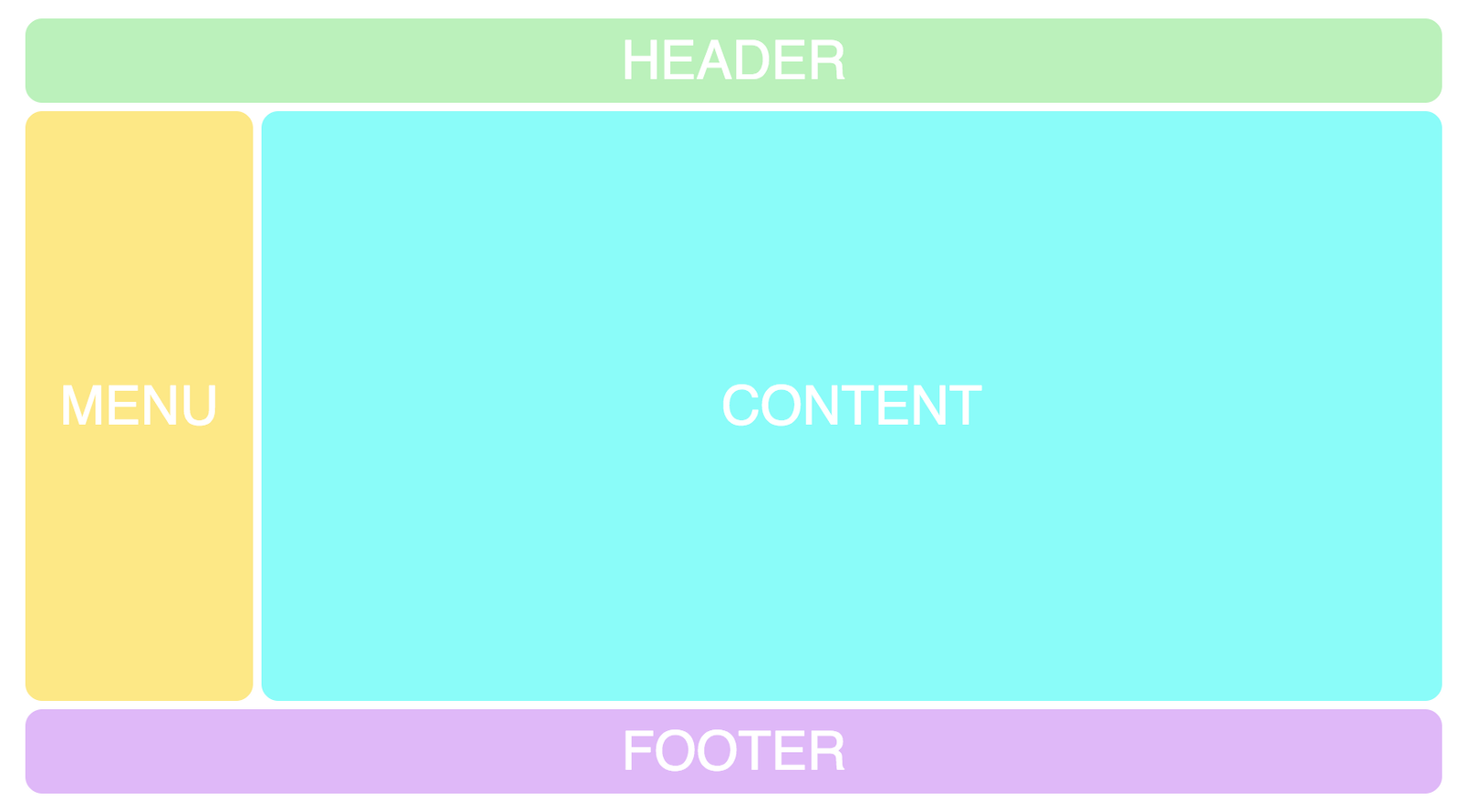 <div class="container"> <div class="header">HEADER</div> <div class="menu">MENU</div> <div class="content">CONTENT</div> <div class="footer">FOOTER</div></div>2. CSS 中的基础设置