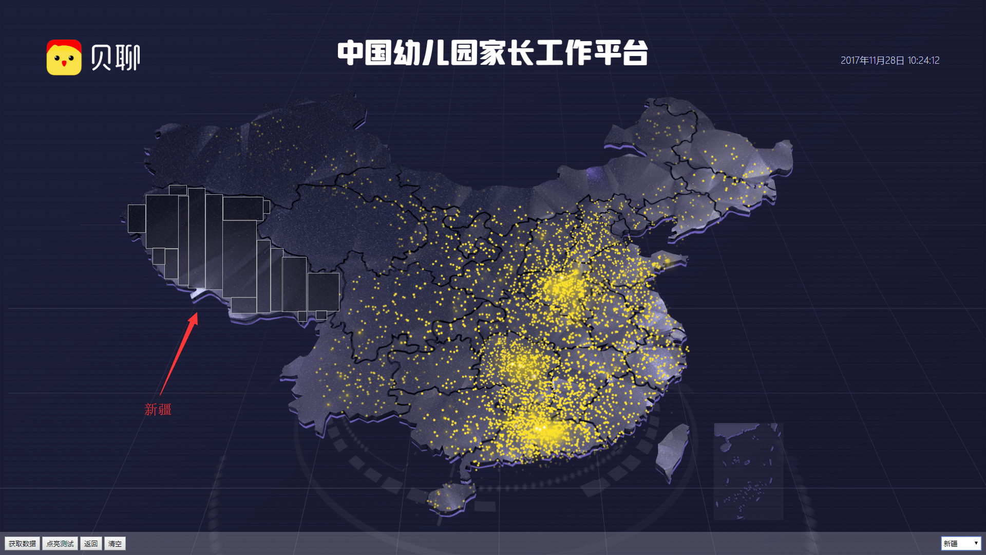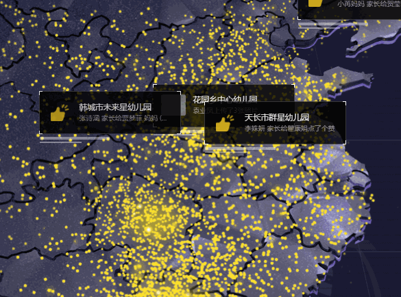 此模块由中国地图、固定的光点、闪烁的光点和动态气泡构成。