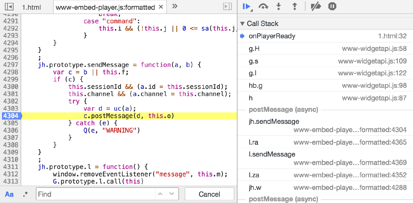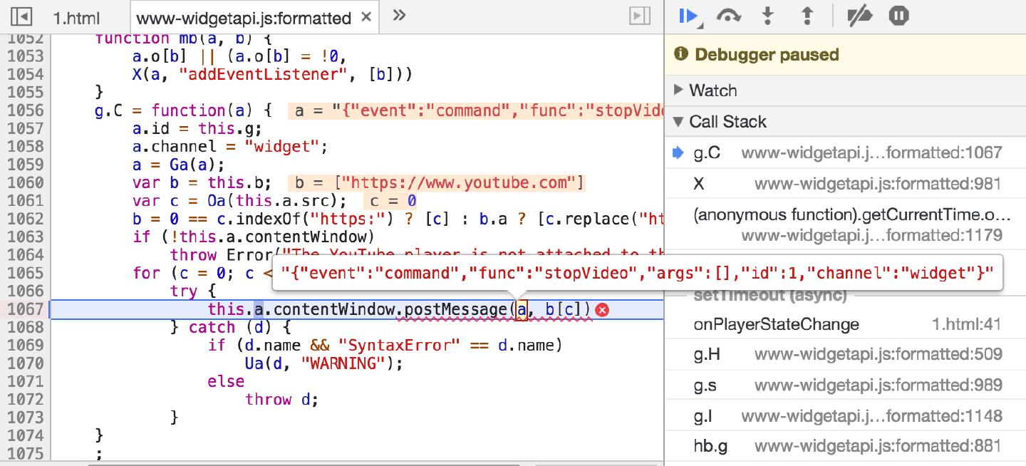 经检查上面代码4304行的c就是window.parent,这个embed-player.js是iframe的js,iframe的js通过postMessage发送了一个消息,如上图右边的窗口所示,然后在父窗口的widgetapi.js就收到了这个消息。