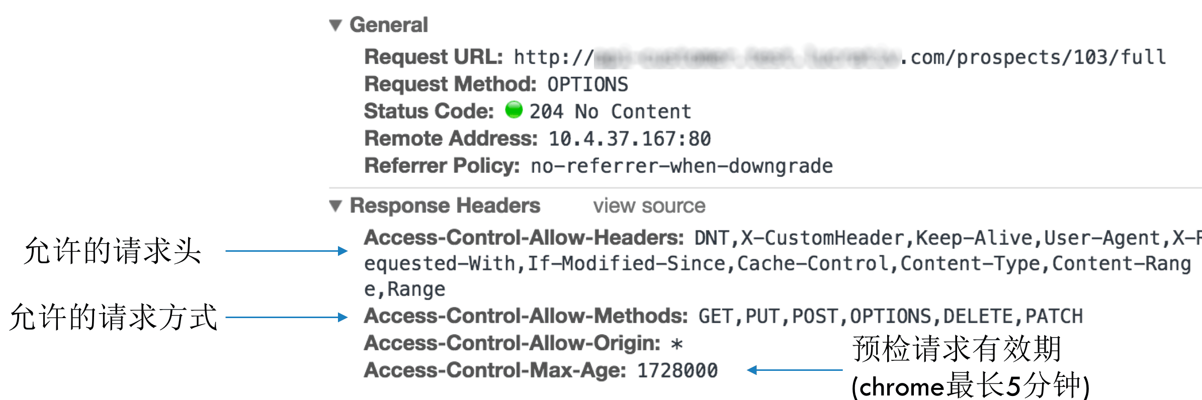 返回头里面包含了允许的请求头、请求方式、源,以及预检请求的有效期,上图是设置了20天,在这个有效期内就不用再发一个options的请求,实际上浏览器有一个最长时间,如Chrome是5分钟。如果在预检请求检测到当前请求不符合服务端设定的要求,则不会发出去了直接抛异常,这个时候就不用去发“复杂”的请求了。