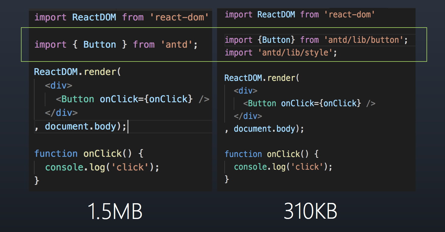 当我们使用组件库的时候,import {Button} from 'element-ui',相对于Vue.use(elementUI),已经是具有性能意识,是比较推荐的做法,但如果我们写成右边的形式,具体到文件的引用,打包之后的区别是非常大的,以antd为例,右边形式bundle体积减少约80%。