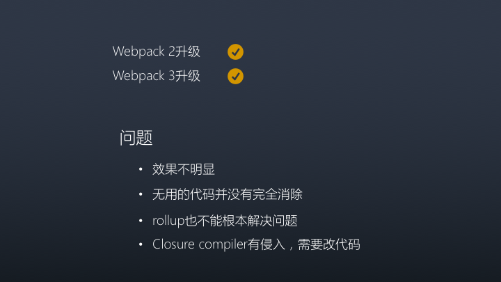 优化还是要继续的,虽然工具自带的tree-shaking不能去除太多无用代码,在去除无用代码这一方面也还是有可以做的事情。我们从三个方面做里一些优化。