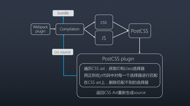 apply (compiler) { compiler.plugin('after-emit', (compilation, callback) => { let styleFiles = Object.keys(compilation.assets).filter(asset => { return /\.css$/.test(asset) }) let jsFiles = Object.keys(compilation.assets).filter(asset => { return /\.(js|jsx)$/.test(asset) }) ....}- 将所有的css文件送至postCss处理,找出无用代码