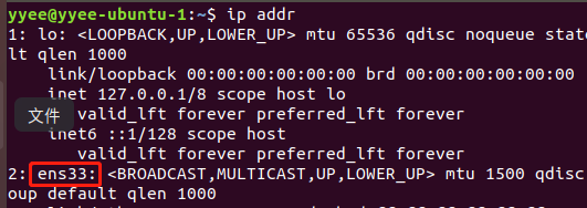 用ip addr命令查看网卡名称,下图可以看出,网卡名称是ens33,网卡名称以你自己的ubuntu系统为准,你的网卡名称可能不是ens33,有可能是ens37这种名称。