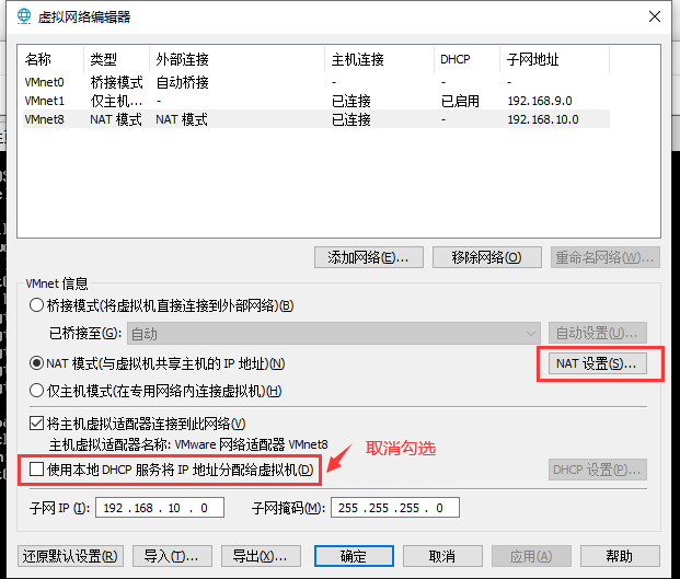 把 “使用本地DHCP服务将 IP地址分配给虚拟机” 前面的勾去掉,目的是禁止动态给ubuntu虚拟机分配IP地址,其它地方不用修改。