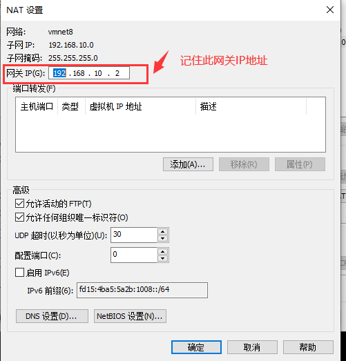 然后一定要把 “网关IP”里面的IP地址192.168.10.2(这个地方以你电脑上的vmware的网关ip地址为准)记录下来,在配置ubuntu网络服务的时候,网关要配到192.168.10.2(以你的wmware网关ip为准)这个IP地址。