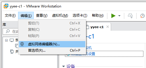 打开vmware,点击顶部的“编辑”菜单,打开 ”虚拟化网络编辑器“ 。