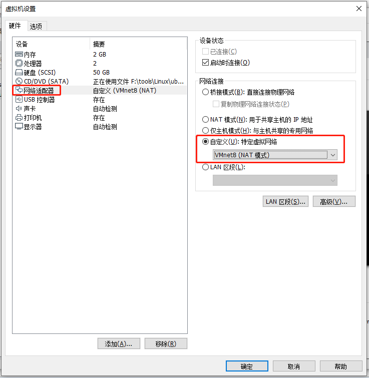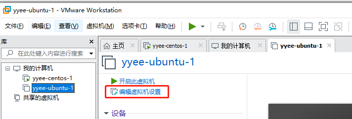 打开VMware,在【我的计算机】 下选中要配置的ubuntu虚拟机,点击【编辑虚拟机设置】,在左侧的【硬件】栏中选中【网络适配器】,选中右侧 【网络连接】 中的【 自定义(U):特定虚拟网络 】选项,选中下面的 【VMnet8 (NAT模式)”】选项,点击【确定】按钮。
