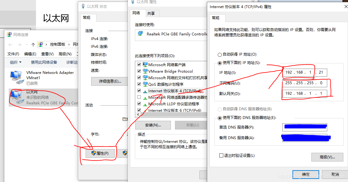 在VMware Network Adapter VMnet8图标上右键,选属性,然后选择“Internet协议版本4(TCP/Ipv4)”选项,然后点击 “属性”按钮。