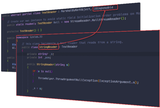 比如,这里被using修饰的reader变量的类型为StringReader,StringReader是实现了IDisposable接口的,如下图: