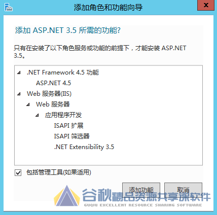 点击[下一步],再点击[下一步],勾选[Web 服务器]下的[应用程序开发]里的ASP.NET 3.5,此时会弹出对话框向导,如下图所示。