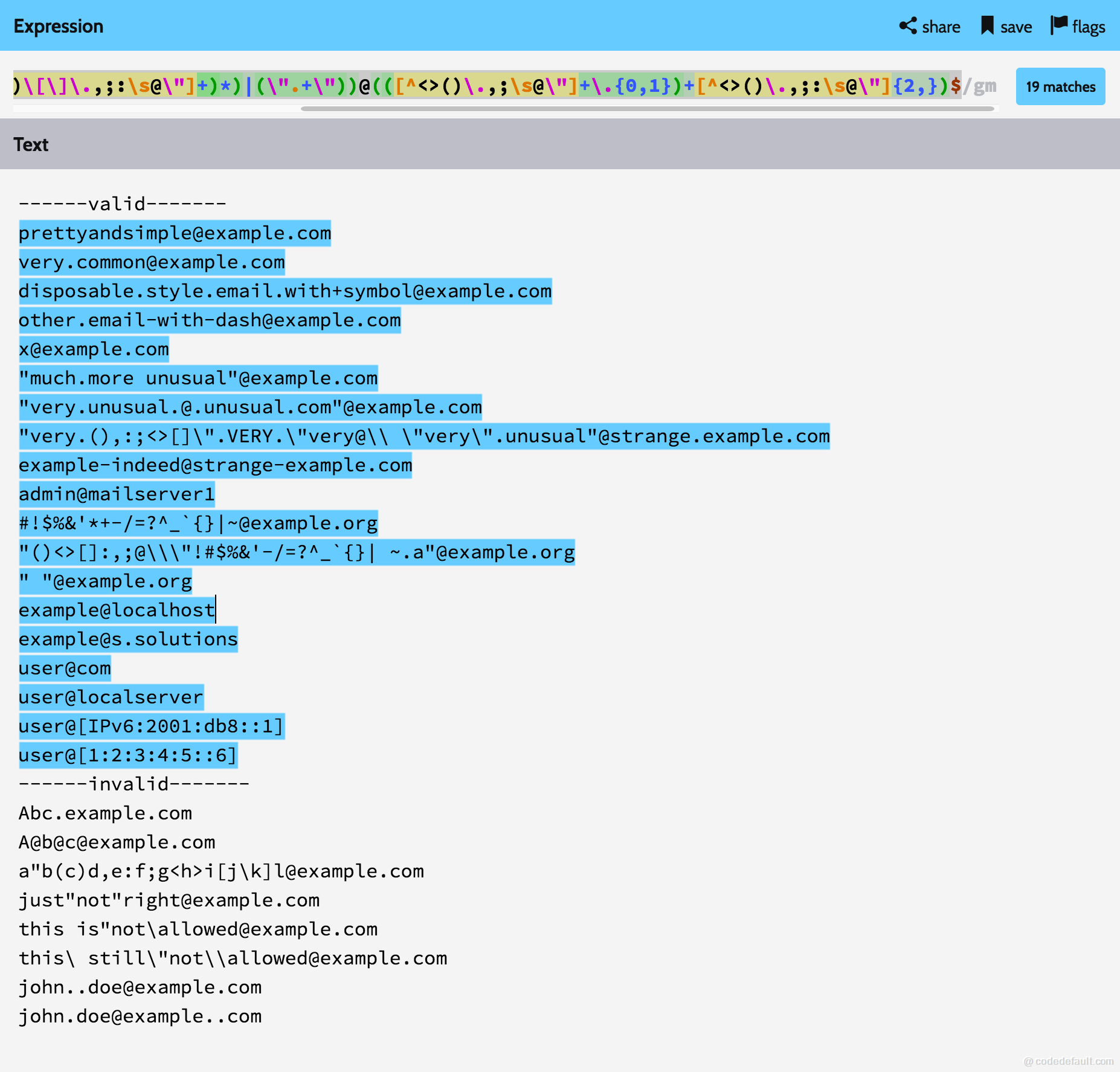 const re = /^(([^<>()[\]\.,;:\s@\"]+(\.[^<>()[\]\.,;:\s@\"]+)*)|(\".+\"))@(([^<>()[\]\.,;:\s@\"]+\.)+[^<>()[\]\.,;:\s@\"]{2,})$/i;示例js代码如下: