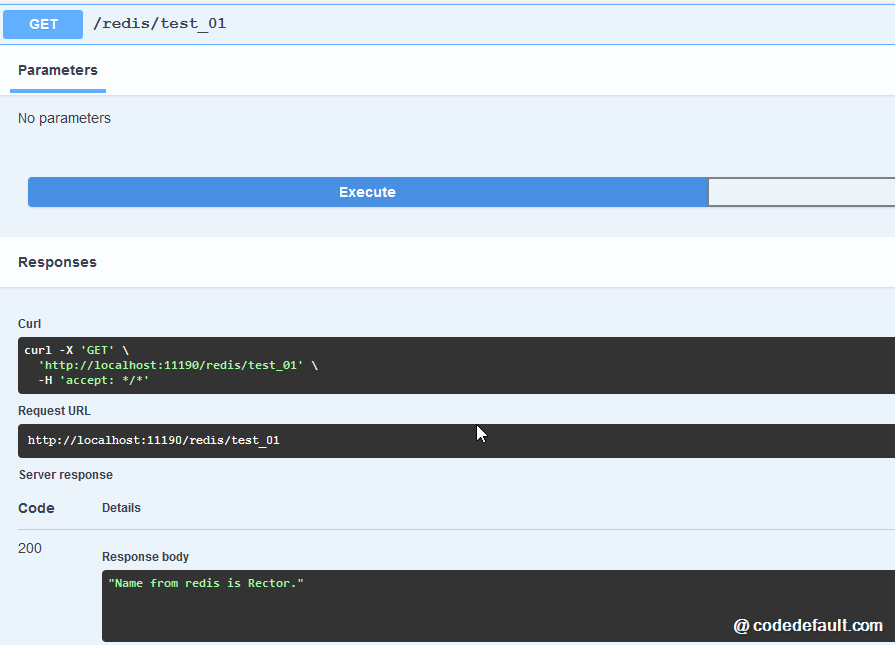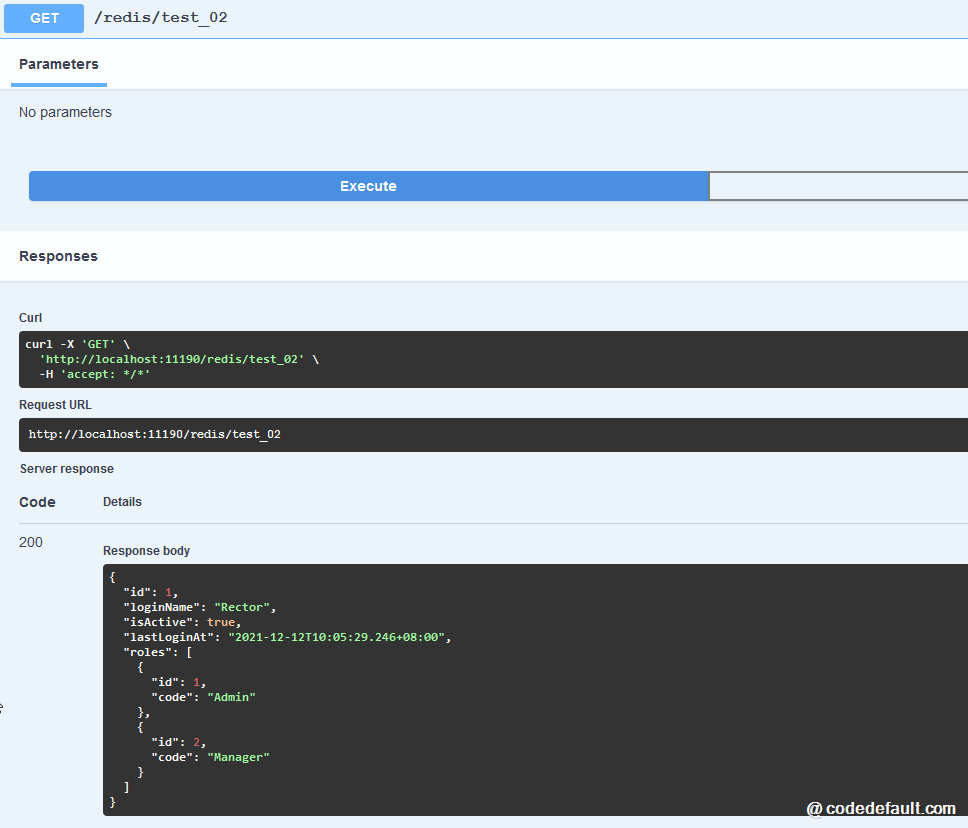 /redis/test_01是简单地存/取一个用户名,而/redis/test_02则是存/取一个用户登录信息对象,完整示例代码如下:using ServiceStack.Redis; var builder = WebApplication.CreateBuilder(args); builder.Services.AddEndpointsApiExplorer(); builder.Services.AddSwaggerGen(); var app = builder.Build(); if (app.Environment.IsDevelopment()) { app.UseSwagger(); app.UseSwaggerUI(); } app.MapGet("/redis/test_01", () => { var client = new RedisClient("127.0.0.1:6379"); client.Set(RedisKeyCollection.UserNameKey(1), "Rector"); var nameFromRedis = client.Get(RedisKeyCollection.UserNameKey(1)); return Results.Ok($"Name from redis is {nameFromRedis}."); }) .WithName("TEST_01"); app.MapGet("/redis/test_02", () => { var client = new RedisClient("127.0.0.1:6379"); var userInfo = new UserInfo(1, "Rector", true, DateTime.Now, new() { new(1, "Admin"), new(2, "Manager") }); client.Set (RedisKeyCollection.UserInfoKey(userInfo.Id), userInfo); var userFromRedis = client.Get (RedisKeyCollection.UserInfoKey(1)); return Results.Ok(userFromRedis); }) .WithName("TEST_02"); app.Run(); /// /// 用于存储Redis键的集合类 /// internal record RedisKeyCollection { ////// 只存储用户名的Redis键 /// public static string UserNameKey(int userId) { return $"user:name:{userId}"; } ////// 用于存储不同用户基本信息的Redis键 /// public static string UserInfoKey(int userId) { return $"user:info:{userId}"; } } ////// 用户登录登录信息实体模型 /// /// 用户ID /// 登录名 /// 是否激活 /// 最后登录时间 /// 角色集合 internal record UserInfo(int Id, string LoginName, bool isActive, DateTime? lastLoginAt, ListRoles); /// /// 用户角色 /// /// 角色名称 /// 角色编码 internal record Role(int Id, string Code);运行结果分别如下: